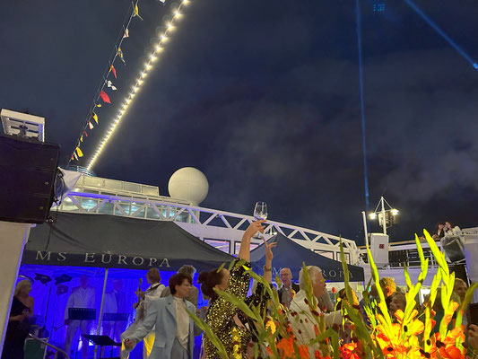 Zusätzlich befeuert wurde die einzigartige Atmosphäre und unbeschwert fröhliche Stimmung nur noch von dem großartigen Wetter. Die Sonne tränkte das Pool-Deck in Orange und strahlte sowohl mit den Passagieren als auch mit den Sterneköchen um die Wette. Nach dem Gourmet-Event legte die EUROPA ab und nahm Kurs durch den Nord-Ostsee-Kanal auf Aerö in Dänemark und Kopenhagen, bevor sie am 22. August 2023 zurück nach Kiel kehrte. Auf der Kurzreise fanden unter anderem ein Wein-Podcast mit Günther Jauch und ein Knigge-Training für interessierte Gäste statt. Musikalisch wurde die Genießer-Reise der EUROPA von Tim Bendzko mit einem exklusiven Konzert für die Gäste begleitet.