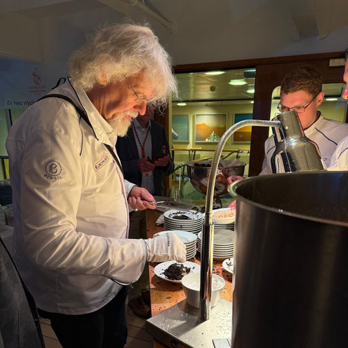 Schon beim Betreten des Pooldecks im Hamburger Hafen spürten wir die besondere Atmosphäre. Gabi Haupt, Senior Advisor Luxury Cruises, und der Multi-Gastronom Karlheinz Hauser begrüßten alle Gäste und setzten damit den feierlichen Auftakt für einen Abend voller kulinarischer Höhepunkte. Mit spürbarer Begeisterung hießen sie die Crème de la Crème der internationalen Kochkunst sowie die herausragenden Winzer an Bord willkommen.