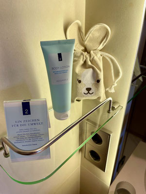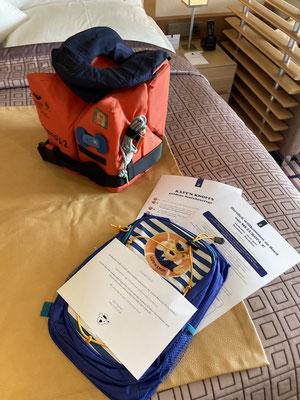 Hier gab es für den Junior allerlei Überraschungen wie einen blauen Rucksack von Käpt ́n Knopf. Über die Paw Patrol Badelatschen, die schon startklar für die erste Entdeckungstour an Bord bereit standen, freute er sich ganz besonders. Auch eine bunte Kinderzahnbürste wartete auf ihren Einsatz. In puncto kinderfreundlicher Ausstattung hat die Reederei Hapag-Lloyd Cruises wirklich an alles gedacht: So waren ein Tritthocker fürs Waschbecken und ein Kinder-Toilettensitz vorhanden. Den Bademantel und die Schwimmweste probierte mein Sohn sogleich an. Diese Kleidungsstücke passten ihm ebenso wie die Flip-Flops wie angegossen.