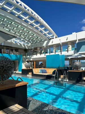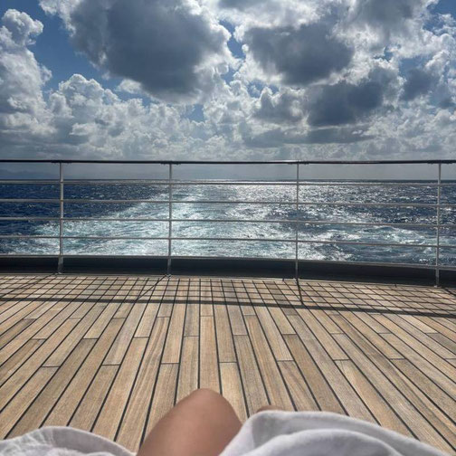Zurück an Bord zog es mich ins Fitnessstudio, danach auf das Pooldeck – ein frischer Saft, Sonne im Gesicht, das Meer als Begleitung.