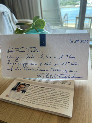 Ich kam früh am Morgen in Heraklion an. Der erste Kaffee im Hafen, die Sonne über Kreta und dieses leise Summen des Schiffs, das schon erwacht war. Anne erwartete mich an Bord, ruhig und gelassen, wie jemand, der genau weiß, wie der Tag auf der EUROPA 2 abläuft. Sie zeigte mir das Schiff, gab mir ein paar Tipps, und wir standen eine Weile auf dem Pooldeck, sahen hinaus auf die Stadt und wussten beide: Jetzt ist Übergabe!