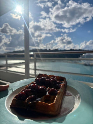 Der nächste Tag war ein Seetag – perfekt für Frühstück in der Suite. Frisches Obst, Croissants, Kaffee und nichts als Horizont. Ich lernte, dass es an Bord manchmal etwas länger dauert, wenn Übungen stattfinden, aber wer Zeit hat, merkt kaum, dass sie vergeht.