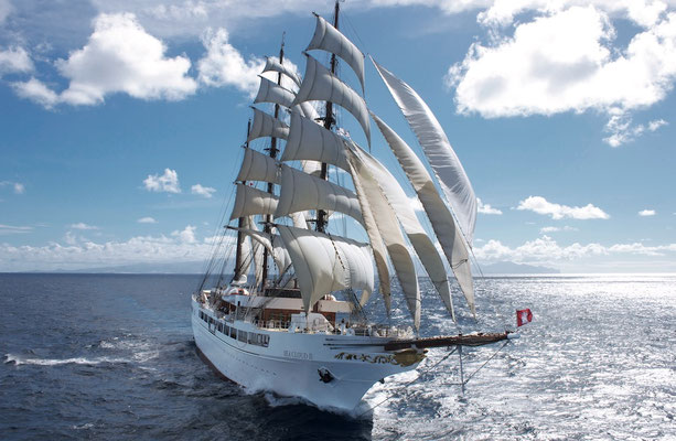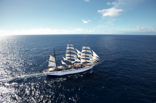 Die SEA CLOUD II ist kein Kreuzfahrtriese, sondern ein elegantes Dreimast-Vollschiff mit 23 Segeln. So oft es der Wind erlaubt, setzt die Crew die fast 3.000 Quadratmeter Segelfläche noch per Hand – ein Schauspiel, das man heute kaum noch erleben kann.