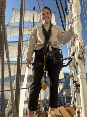 Um 9:30 Uhr treffen sich alle Teilnehmer an Deck. Nach einer kurzen Einteilung werden wir auf die einzelnen Masten verteilt. Die Stimmung ist erwartungsvoll, ein bisschen aufgeregt – man spürt, dass das für viele an Bord ein großer Moment ist. Nach der ausführlichen Sicherheitseinweisung geht alles sehr schnell: Noch einmal wird der Sitz des Gurtes überprüft, die Karabiner werden kontrolliert, und plötzlich stecke ich als Erste im Sicherheitsgeschirr. Jetzt gibt es kein Zurück mehr.