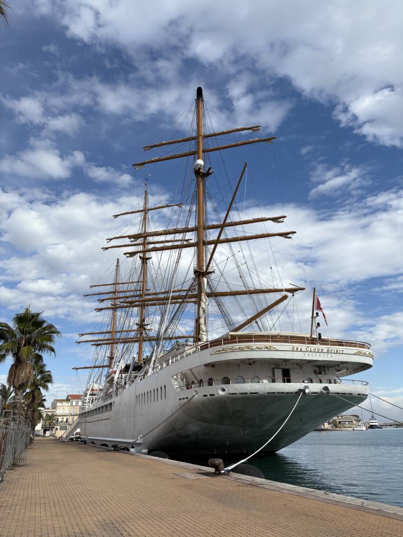 Was mich dort erwartet, lässt sich kaum in Zahlen oder Fakten ausdrücken: ein spektakulärer Blick über das Schiff und das Meer. Von oben wirkt die Sea Cloud Spirit noch eleganter, fast zierlich, wie ein Modell, das jemand liebevoll auf das tiefblaue Mittelmeer gesetzt hat. Die weißen Decks, die klaren Linien, die Masten, die sich in den Himmel strecken – und rundherum nur Wasser und Horizont. In diesem Moment wird greifbar, was für eine Leistung die Crew tagtäglich erbringt, wenn sie hier oben arbeitet, bei jedem Wetter, bei jedem Segelmanöver.