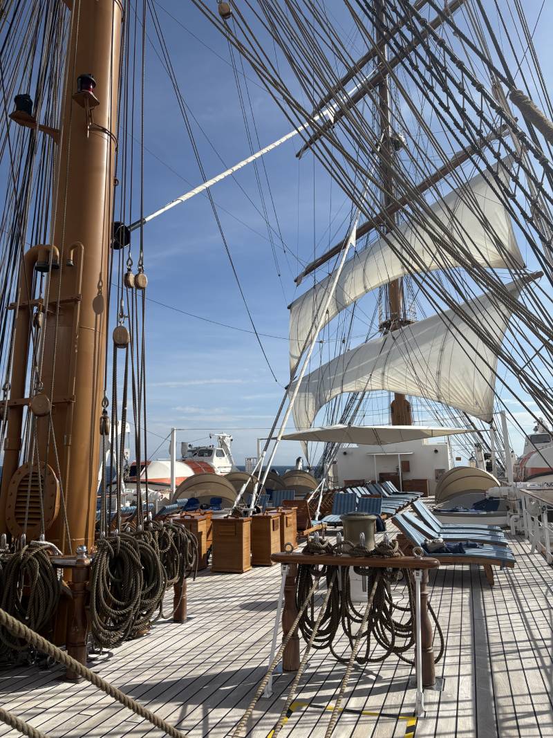 Nach der obligatorischen Sicherheitseinweisung bleibt Zeit, meine Kabine zu beziehen und das Schiff zu erkunden: Lido Deck, Sonnendecks, Restaurant, Bibliothek – alles ist stilvoll, klassisch-elegant. Besonders beeindruckend sind die Masten, die sich über mir in den Himmel strecken. Immer wieder bleibe ich kurz stehen, lasse den Blick an den Wanten hinaufgleiten und frage mich, wie es wohl dort oben sein muss. Noch ahne ich nicht, dass ich wenige Tage später selbst ein Stück hinaufklettern werde.