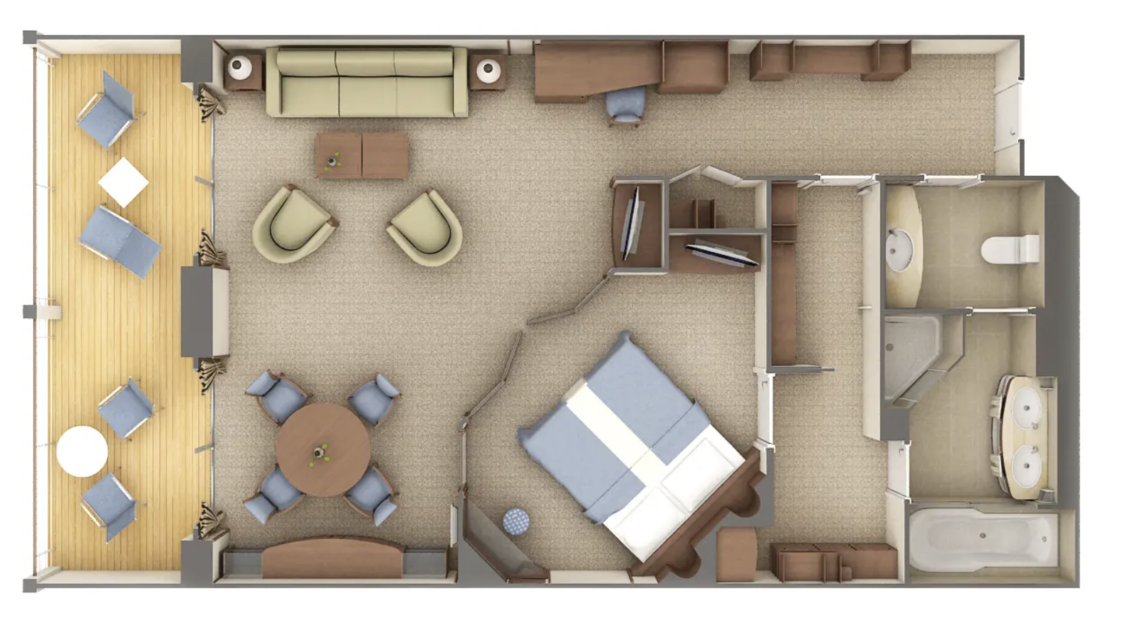 Die zeitgemäße und stilvolle Silver Suite an Bord der Silver Whisper verfügt über getrennte Ess- und Wohnbereiche sowie eine großzügige Veranda. Dank ihrer zentralen Lage in der Mitte des Schiffs sorgt sie für ein äußerst komfortables Wohngefühl. Die Silver Suiten bieten Platz für bis zu drei Gäste. Beachten Sie jedoch, dass der 3. Gast auf einem bequemen Schlafsofa im Empfangsbereich der Suite schläft.