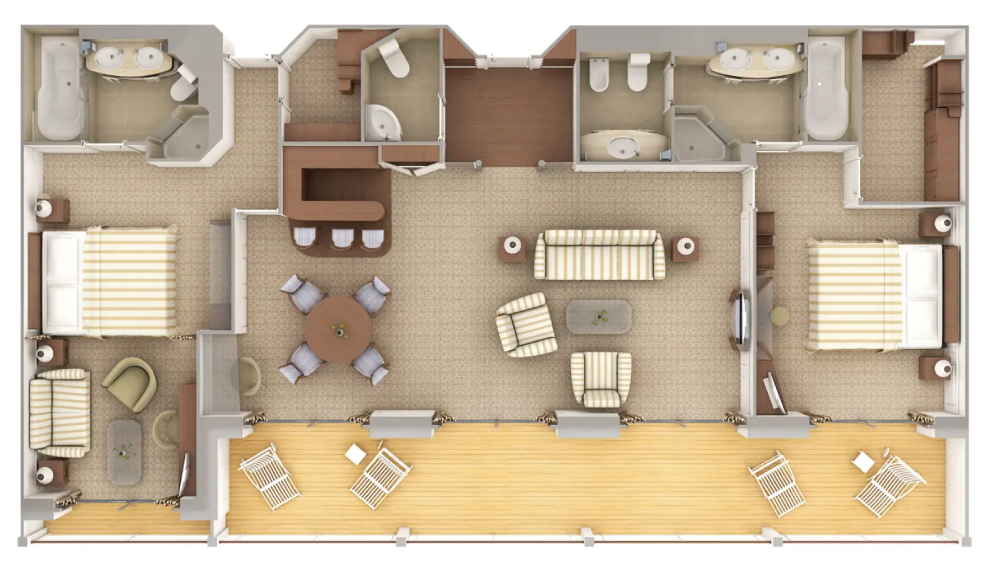 Die Deluxe Veranda Suiten bieten großzügigen Platz und überzeugen mit einer ansprechenden Inneneinrichtung. Egal, ob es morgens, mittags oder abends ist, sie ist der ideale Ort zum Entspannen! Die schiffsmittig gelegenen Suiten sind perfekt positioniert, um den Aufenthalt an Bord zu genießen. Verweilen Sie bei einem Aperitif vor dem Abendessen, frühstücken Sie mit atemberaubender Aussicht oder lassen Sie sich einfach von der sanften Abendbrise auf Ihrer privaten Teakholz-Veranda betören. Vom entspannenden Bad bis zum erholsamsten Schlaf aller Zeiten - die Deluxe Veranda Suite ist die perfekte Wahl für anspruchsvolle Reisende.