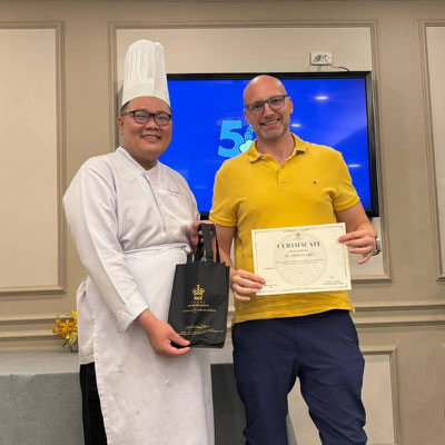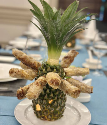 Später, im Garten des legendären Rex Hotel Saigon, eines der traditionsreichsten Fünf-Sterne-Häuser Vietnams, rückte das kulinarische Handwerk in den Mittelpunkt. Unter Palmen und Fächern aus Bambusblättern tauchten wir in die Welt der vietnamesischen Küche ein und erfuhren, wie man Speisen in kleine Kunstwerke verwandelt. Mit geübten Handgriffen zeigte uns der Küchenchef, wie aus einfachen Zutaten duftende Chả Giò - das sind vietnamesische Frühlingsrollen - entstehen. Knusprig golden ausgebacken, kunstvoll auf einer Ananas arrangiert und begleitet von einer aromatischen süß-sauren Fischsauce.