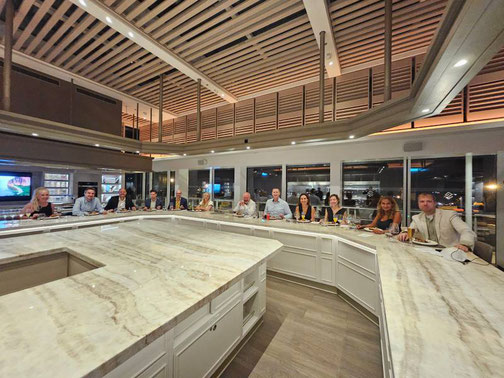 In der Mitte dieses hellen, modernen Raums saßen wir alle gemeinsam an der großen Marmorplatte. Lachen mischte sich mit Staunen, Gespräche mit Genuss. Es fühlte sich an, als wären wir zusammen auf Entdeckungsreise – nur eben mit Messer, Gabel und Stäbchen.