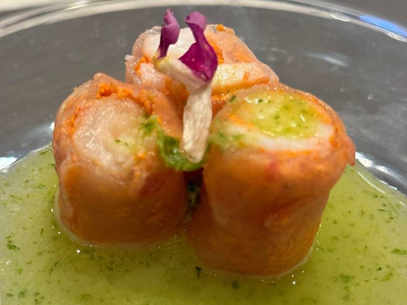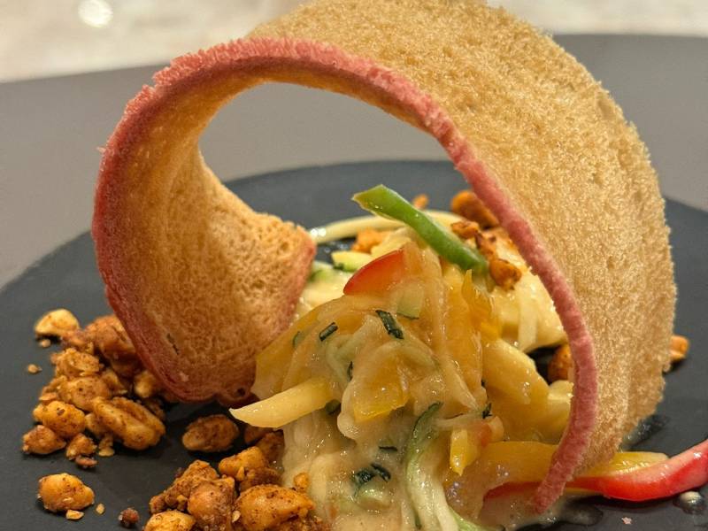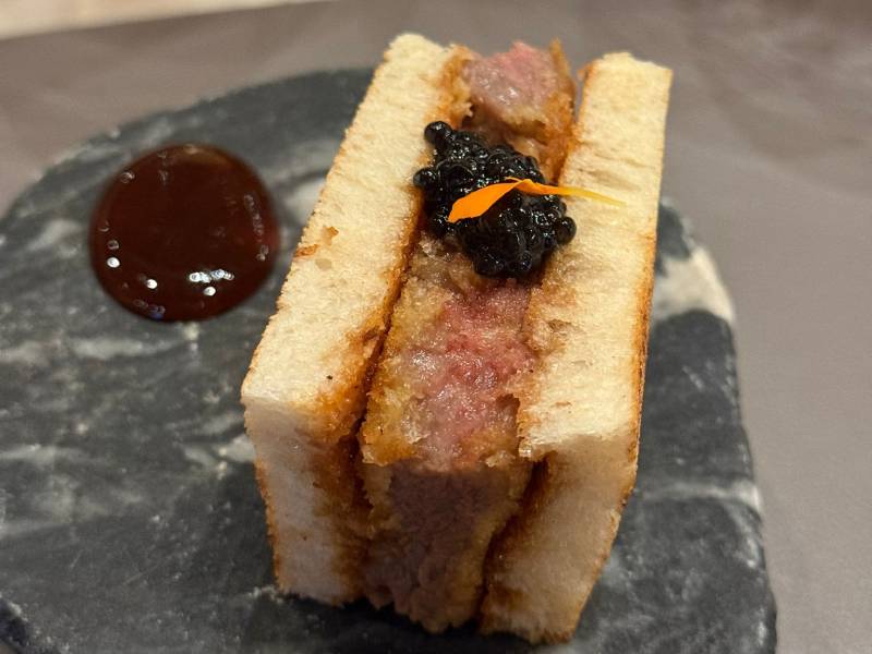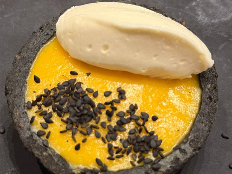 Gang für Gang entfalten sich Aromen, Texturen und Farben: knusprige Tempura-Pilze mit zarter Yuzu-Creme, cremig-mildes Tatar auf knusprigem Reis, kunstvoll arrangierte Gemüsekompositionen und filigrane Dim Sum in aromatischer Brühe. Dazu kamen kleine Sensationen: ein Mini-Katsu-Sandwich mit Kaviar, karamellisierte Schweinewürfel in süß-scharfer Gochujang-Sauce und ein Dessert aus Mango, schwarzem Sesam und Kokos, das fast zu schön war, um es zu essen.