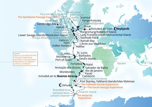 Beide Reisen beinhalten Aufenthalte vor der Kreuzfahrt in Reykjavik und Charterflüge nach Kangerlussuaq bzw. nach Buenos Aires nach der Kreuzfahrt.
